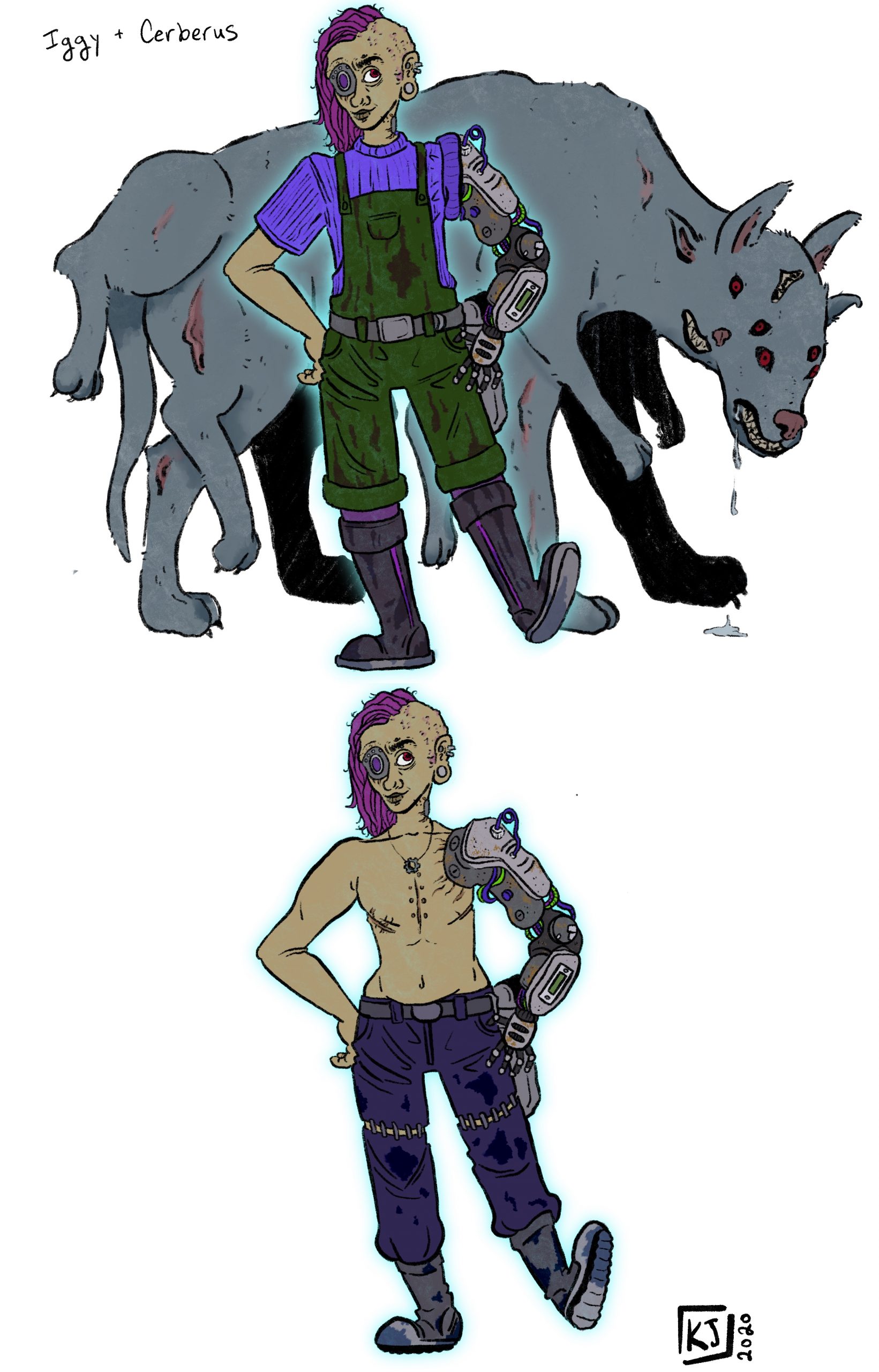 I actually drew this a bit ago and am finally putting it up here. I have been helping playtest Era of Silence, a new in-development game by Shrike Tabletop, and I have really been enjoying it. One of the creators of Shrike Tabletop, my friend Robin B, is running the game. This is my character Iggy! They are a Parathan Alchemist who has a “gotta catch ’em all” approach to body modification. They also have befriended a large mutant dog. Y’know, like you do.